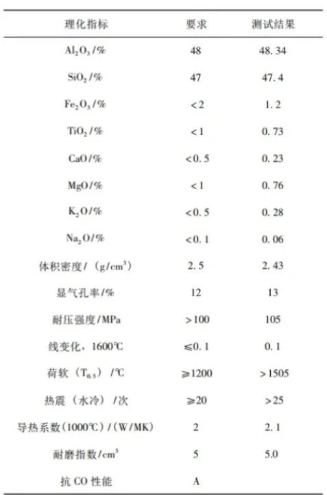 沸騰氯化爐內(nèi)襯材料主要采用Al₂O₃和SiO₂,物相組成主要為莫來石,主要化學(xué)成份及物理性能測試見表1。