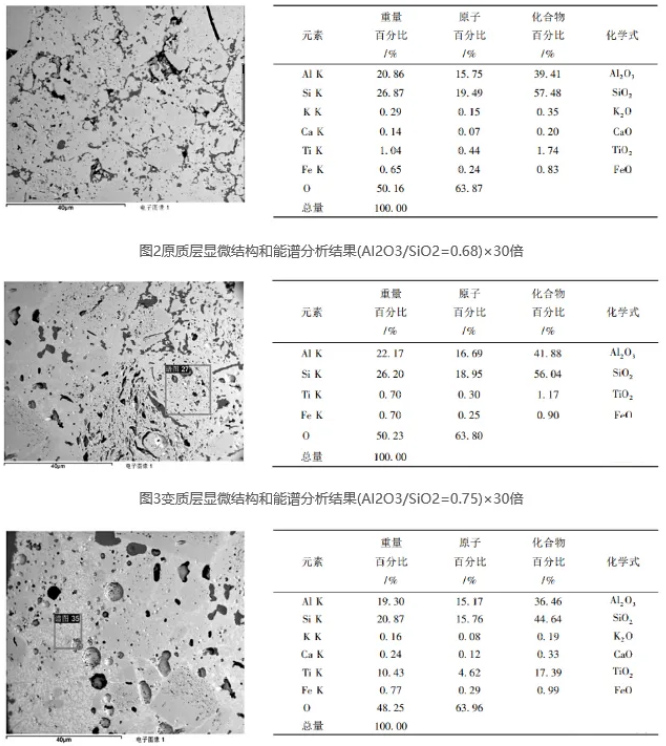從熱力學(xué)上看,Al₂O₃-SiO₂系材料[4]各物相在氯化反應(yīng)中:莫來石相(A₃S₂)非常不穩(wěn)定,其成份見表2,石英相(SiO₂)非常穩(wěn)定,剛玉相(Al₂O₃)居中;在碳熱還原中:石英相非常不穩(wěn)定,剛玉相非常穩(wěn)定,莫來石相居中。在實際中,爐襯材料是如何損壞的,其過程是怎樣發(fā)生的,這要從殘磚顯微結(jié)構(gòu)分析入手。
