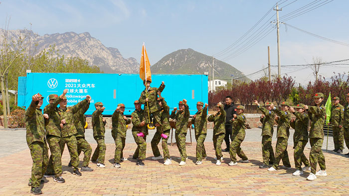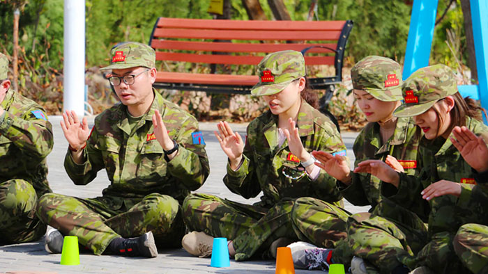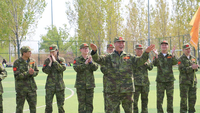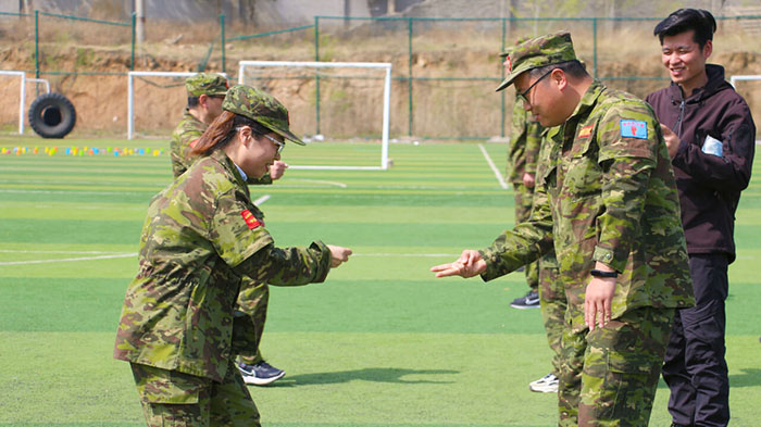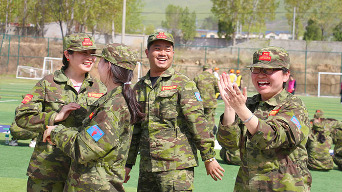 開訓(xùn)前,在破冰啟航環(huán)節(jié)——【智勇通關(guān)】項(xiàng)目中,每組選一個大魔王來防守別隊(duì),該隊(duì)隊(duì)員依次挑戰(zhàn)大魔王,石頭剪刀布定輸贏,贏了直接通過,輸了轉(zhuǎn)一圈,回來接著挑戰(zhàn),再輸即增加圈數(shù),直到全部隊(duì)員通過。大家把團(tuán)隊(duì)當(dāng)成了自己的“城堡”,在“對抗魔王”中,每個隊(duì)員都拼盡全力,期待被幸運(yùn)女神光顧,期待團(tuán)隊(duì)能盡早完成任務(wù),大家的歡笑聲、喝彩聲灑滿了訓(xùn)練場。