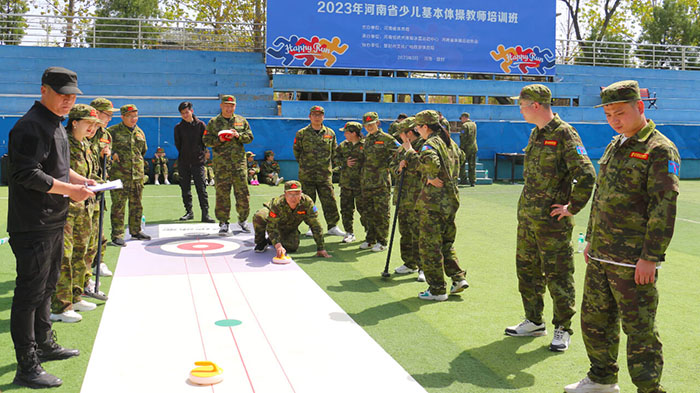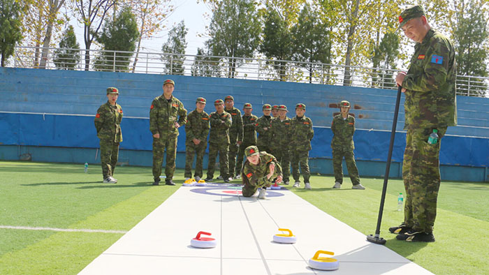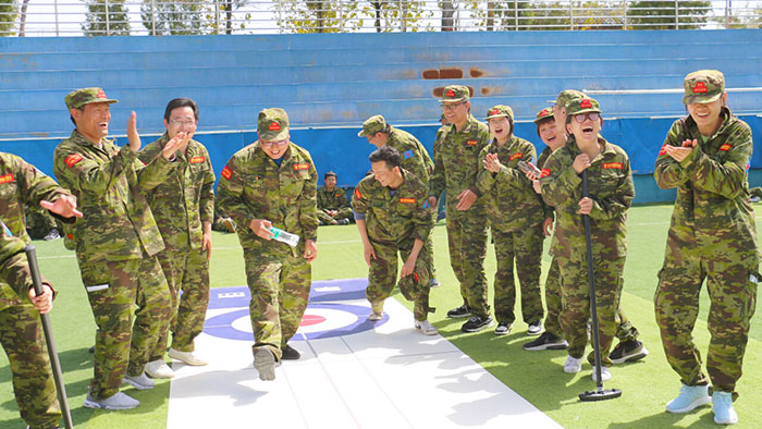 在【旱地冰壺】項(xiàng)目中,八個小組的隊(duì)員們一邊商榷對敵戰(zhàn)術(shù),一邊進(jìn)行任務(wù)分配。隨著一聲哨響,兩個賽隊(duì)同時開賽。隊(duì)員們?nèi)褙炞、凝神靜氣,向前邁步?jīng)_刺,揮動手臂擲壺,冰壺按照隊(duì)員們設(shè)想的路線擊打到對方的冰壺,使其滑出得分圈并穩(wěn)穩(wěn)地停留在中心點(diǎn),成功得分,大家歡呼雀躍,圍觀隊(duì)員們也紛紛叫好,掌聲、歡呼聲此起彼伏,好不熱鬧。