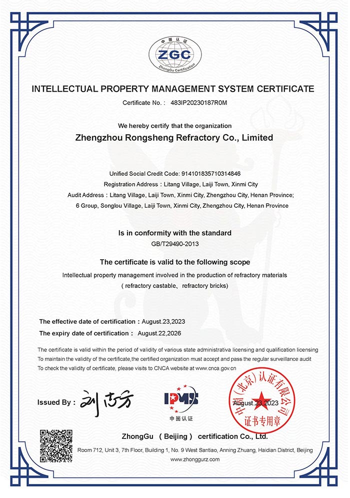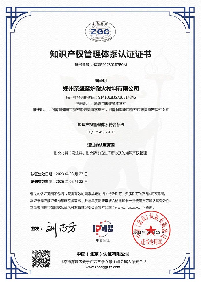 近日,鄭州榮盛窯爐耐火材料有限公司(以下簡稱「榮盛耐材」)順利通過國家知識產(chǎn)權(quán)貫標(biāo)認證,并獲得了《知識產(chǎn)權(quán)管理體系認證證書》中英文雙語認證。該項認證的順利通過,標(biāo)志著榮盛耐材構(gòu)建了一套規(guī)范化、系統(tǒng)化、程序化、精細化的知識產(chǎn)權(quán)管理體系。