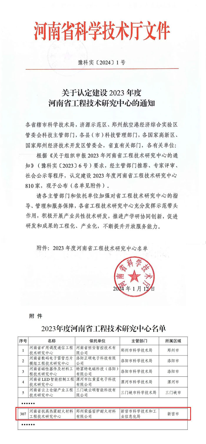 近日,河南省科學技術廳發(fā)布了《關于認定建設2023年度河南省工程技術研究中心的通知》。經申報、主管部門推薦、專家論證和研究等程序,鄭州榮盛窯爐耐火材料有限公司(以下簡稱“榮盛耐材”)申報的“河南省抗高熱震耐火材料工程技術研究中心”正式獲批。